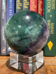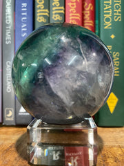 This Fluorite Crystal Sphere shows some stunning rainbow flash and weighs approx. 454 grams.