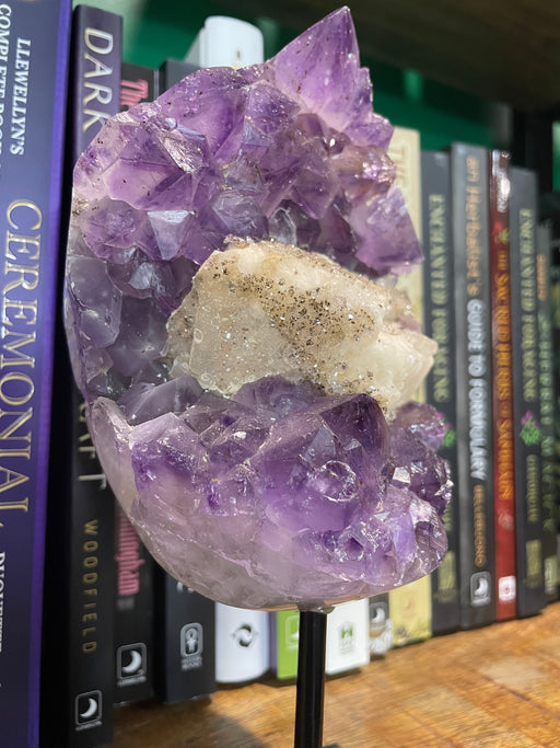 View full detailsAmethyst Cluster with Calcite on Metal Stand