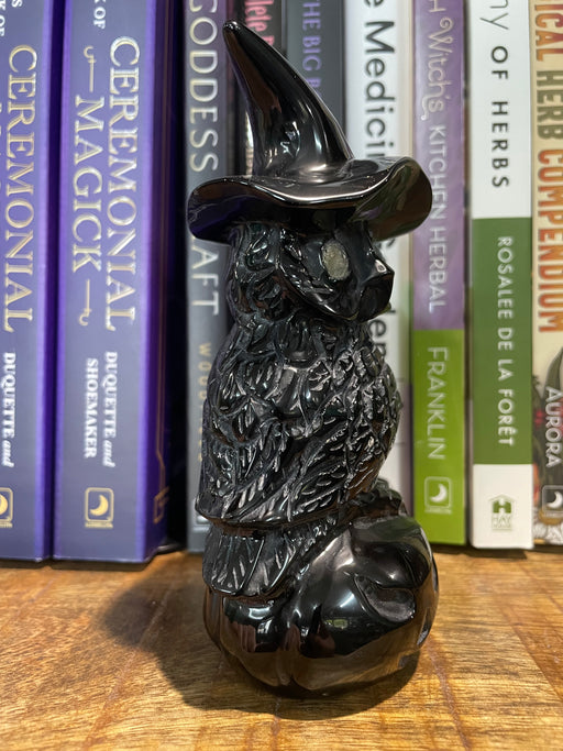 Black Obsidian owl wearing a witches' hat and perched on a pumpkin. The owl has Labradorite eyes. Height approx. 13.5 cm, Weight approx. 435 grams.